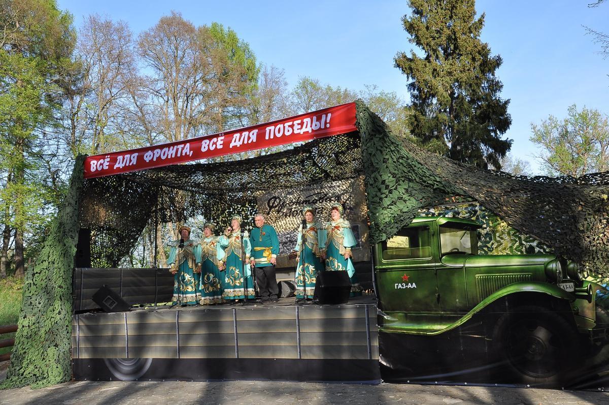 На территории парка была создана обстановка, приближенная к военному времени: воинские палатки, импровизированный блиндаж, укрытая маскировочной сеткой сцена, с которой звучат фронтовые песни. Большой интерес посетителей, особенно у детей и мужчин, вызвала выставка машин времен Великой Отечественной войны.